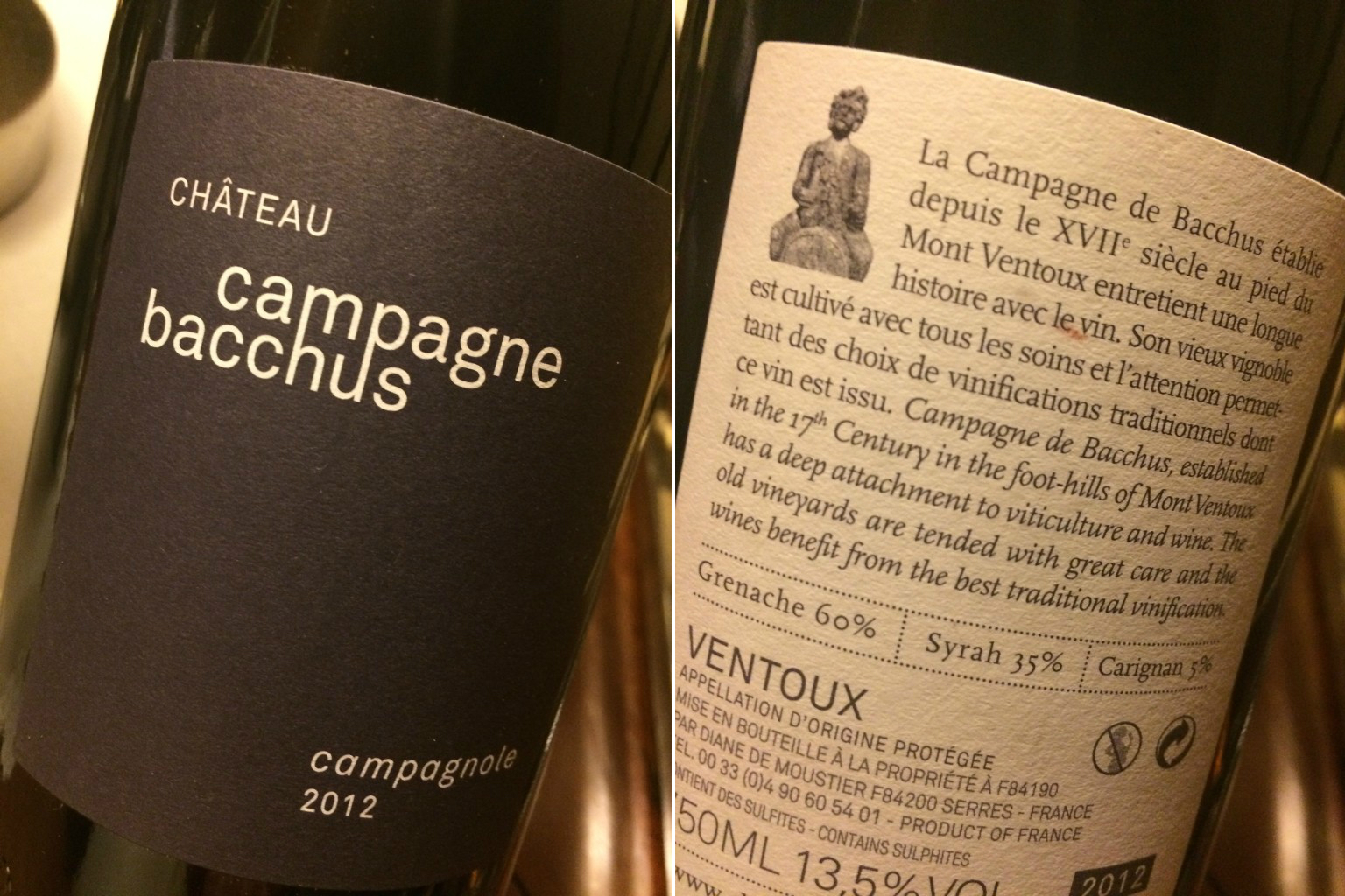 Allure du flacon, sticker: un blason d’une tête Corse stylisée avec 2 sirènes en relief dans le moulage du verre sur le haut du flacon, une imprimerie noire classieuse et un médaillon couleur lie de vin du Dieu Bacchus tenant une écuelle de vin.