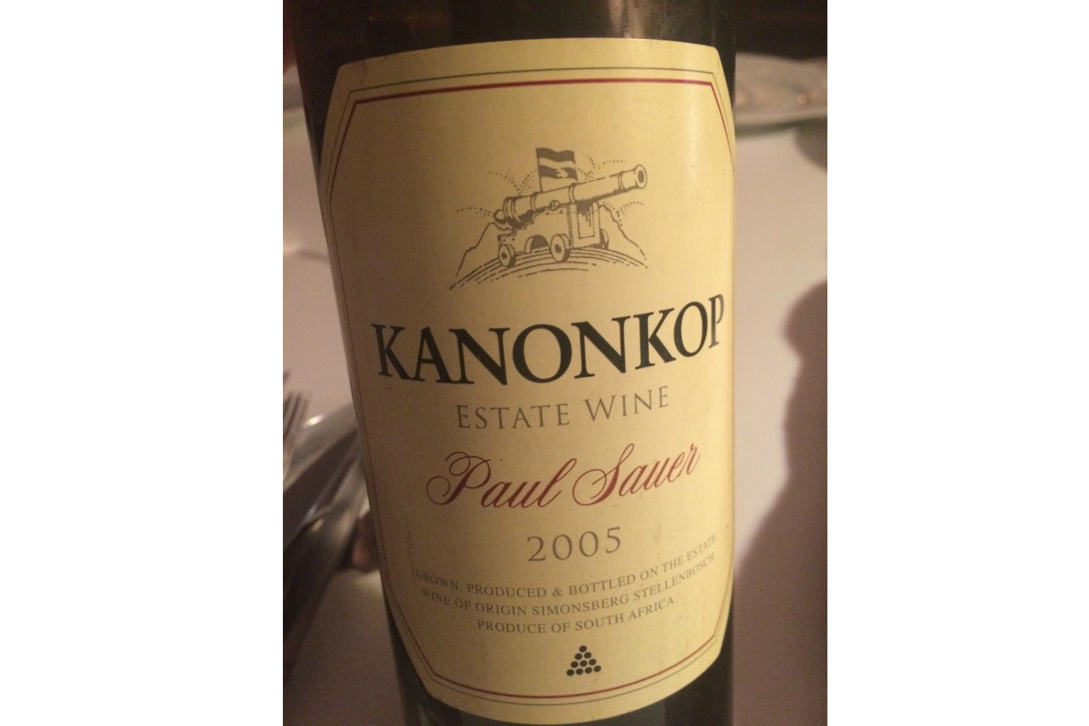 Allure du flacon, sticker : sobre, style bordelais, effigie d’un canon d’antan comme porte-drapeau emblématique d’une cuvée à l’honneur de l’homme politique ministre des terres et forêts, vigneron renommé des années 60 : Paul Sauer.