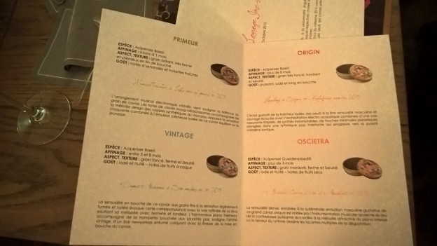 Quatre caviars différents à la personnalité singulière sont soulignés par leurs quatre musiques respectives choisies selon le principe conceptuel Wine4Melomanes. Les accords musicaux choisis sont tous du millésime 2015 compte-tenu de l’année de prélèvement des œufs des caviars en dégustation.